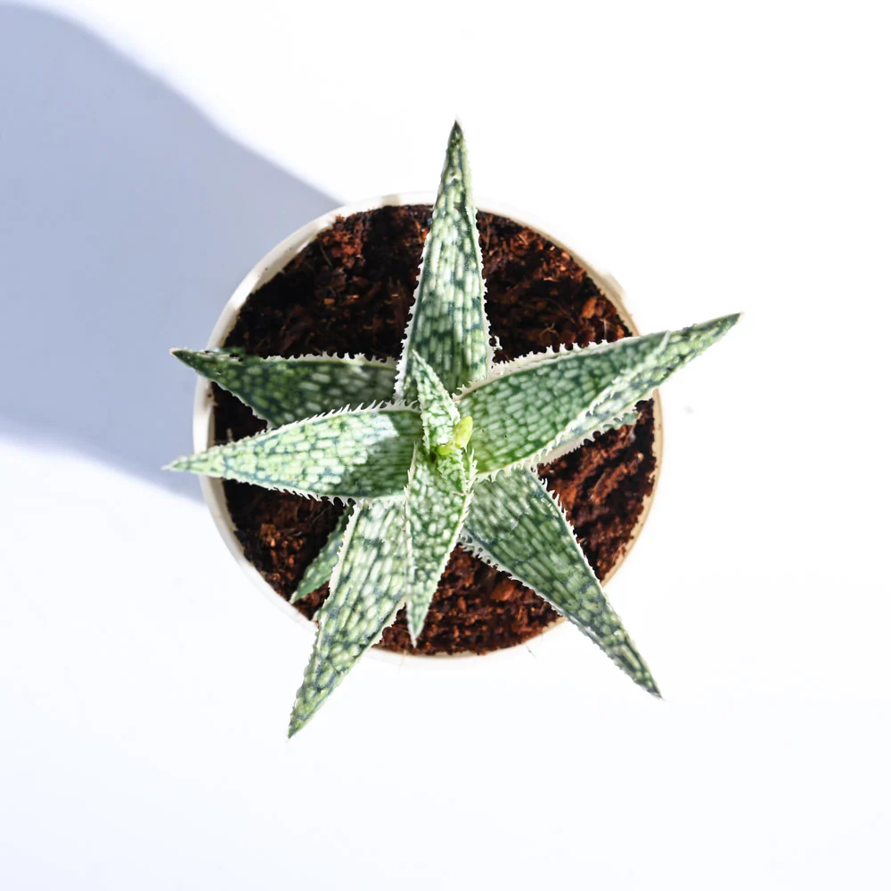 The Aloe Blizzard is a compact and variegated variety of succulent. It features upright, pale green fleshy leaves with white spots or stripes and toothed margin and has frequent flowering periods. Plant it in a bright geometric planter and bring green to your work or side tables.