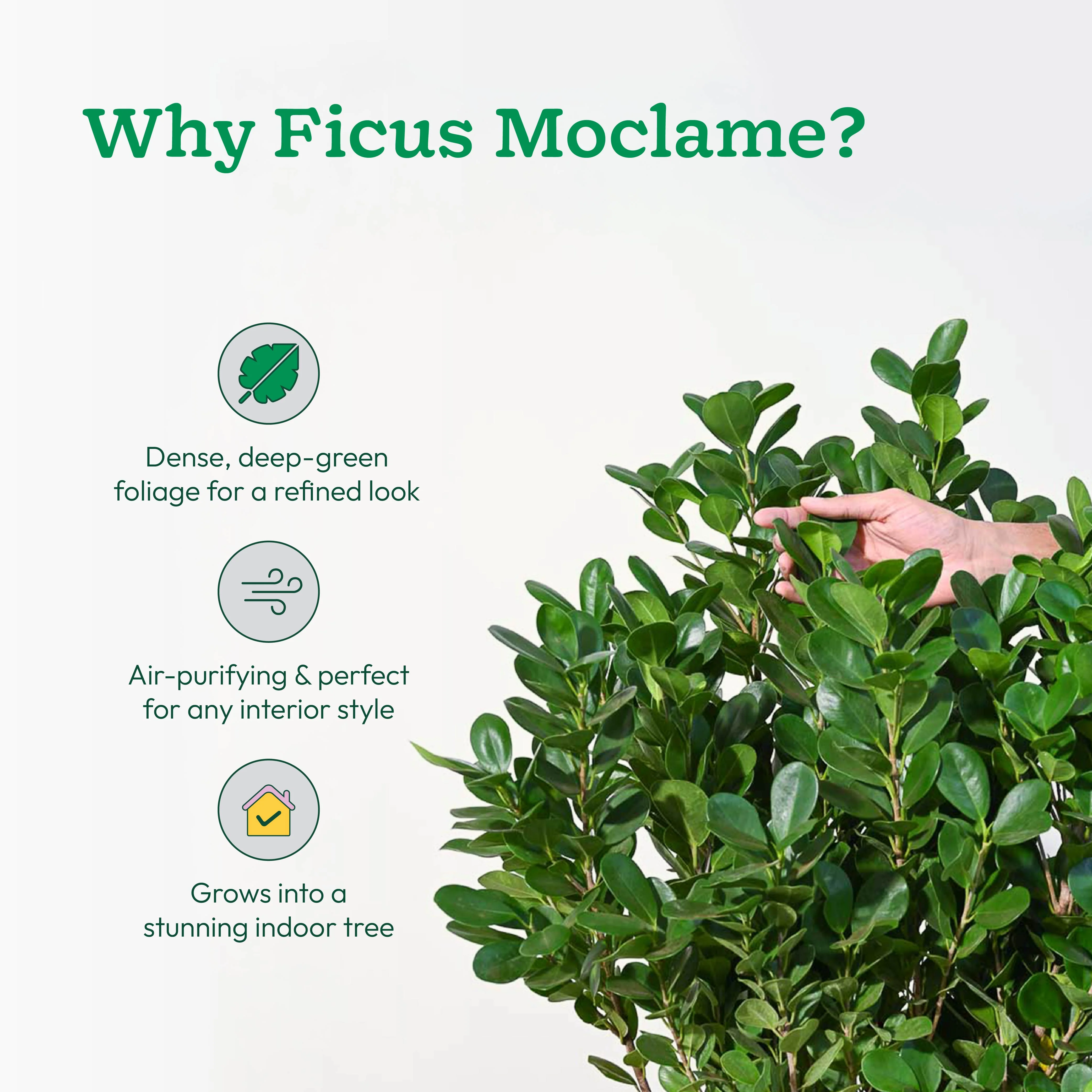 Famous for their thick round leaves with glossy finish that distinguishes it from its more famous cousins like the weeping fig and the fiddle-leaf fig. The moclame plant needs partial to bright indirect light and can be placed near a south or west facing window for large impressive foliage.