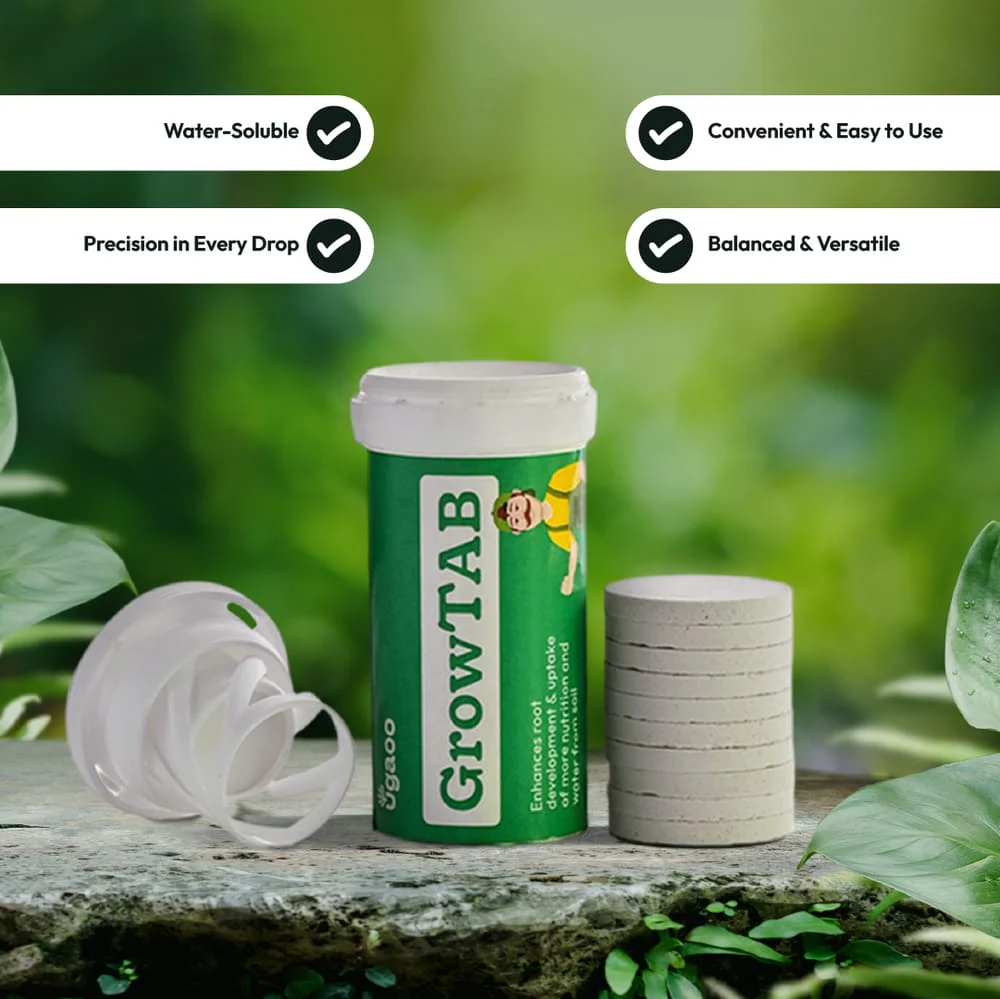 An easy to use complete plant nutrient in a tab that can be simply added to water and applied directly to your plants. The GrowTAB provides the complete range of nutrients required by your plants for perfect health and great immunity. It promotes foliage growth and improves root health by providing complete nutrition and energy for faster sturdier growth. Dissolve the GrowTAB in water and apply directly to roots or spray on leaves early morning or late evening when the sun is not at its peak. It also helps improve produce quality and quantity in fruiting plants.