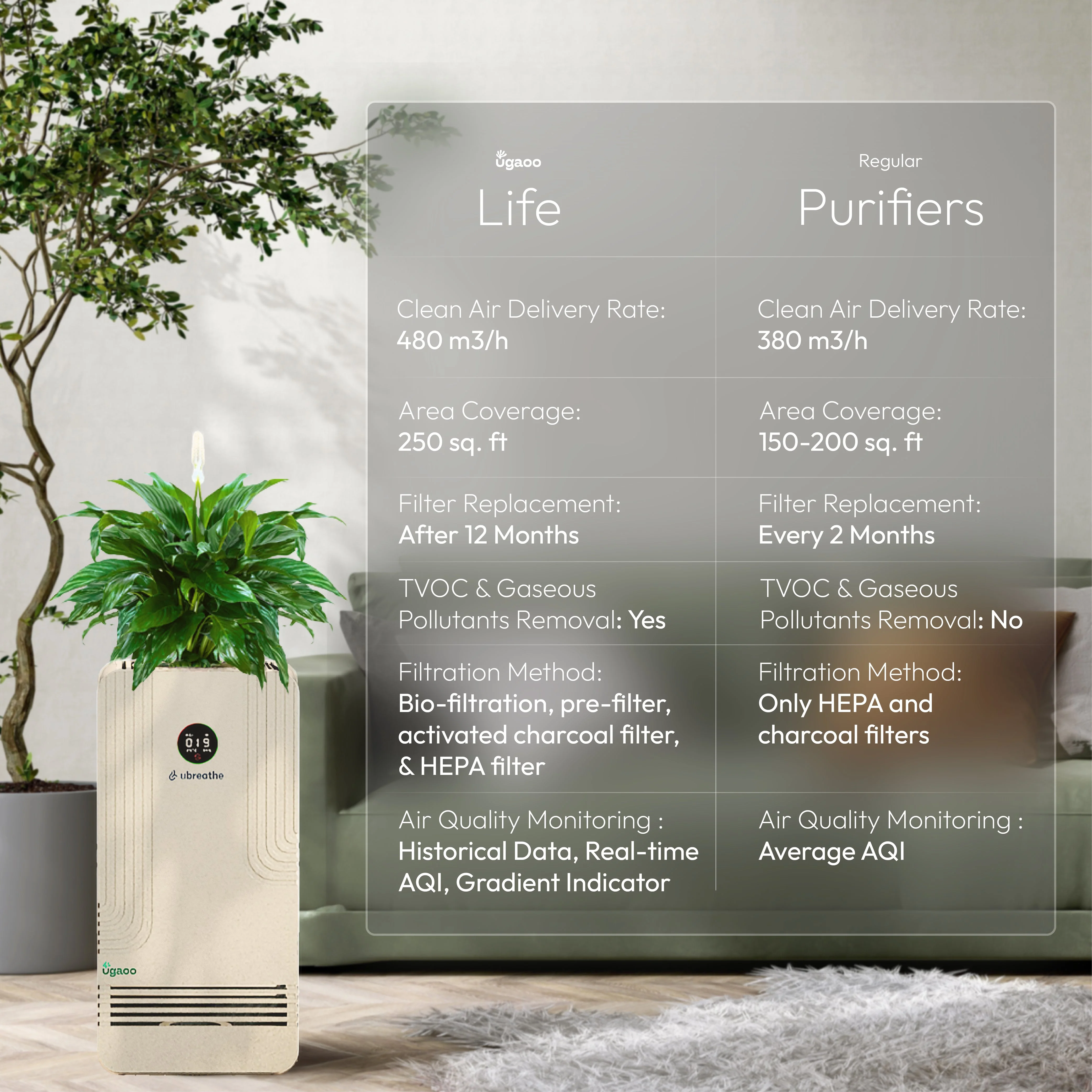 Designed to bring you the best of nature and health indoors, the Ugaoo x uBreathe Life Air Purifier is the perfect addition to your home or office spaces. Highly efficient, multi-functional, and effective at filtering the air around it, this Air Purifier is built for the best. With an in-built, 5-stage filtration process; the purifier ensures that all the pollutants in your space get filtered out. It effectively filters out gaseous pollutants, harmful VOCs, and other bio-pollutants that can cause harm to your respiratory system in the long run. The air moves through its 5 filters - the bio-filter, pre-filter, carbon filter, HEPA filter, and UV layer - to come out much cleaner and healthier; ensuring a better way of life for you and your loved ones. Additionally, this purifier harnesses the power of almost 500 plants, making it a powerful purifier for all your indoor spaces.